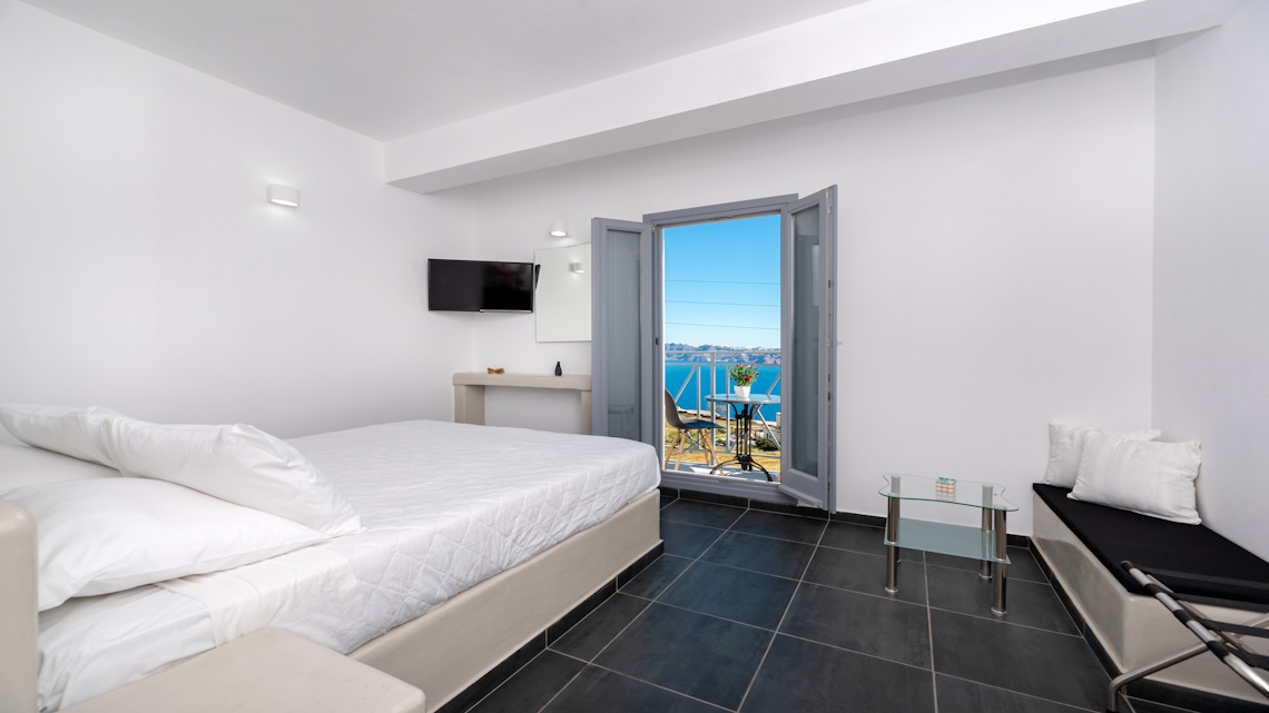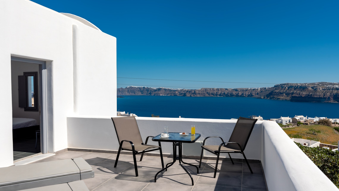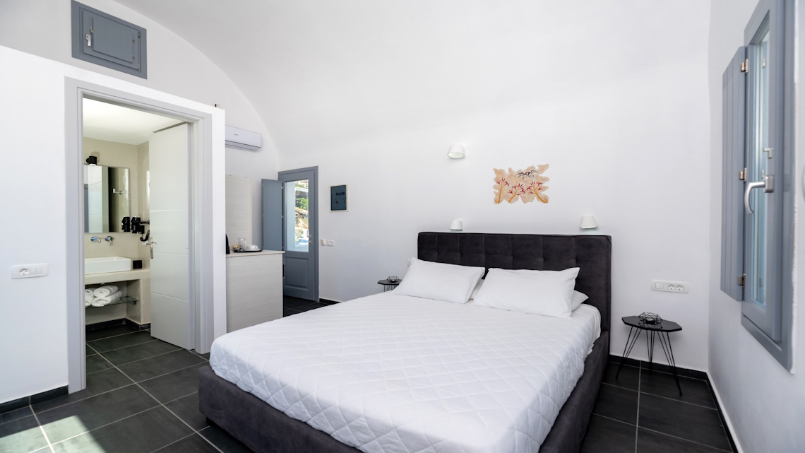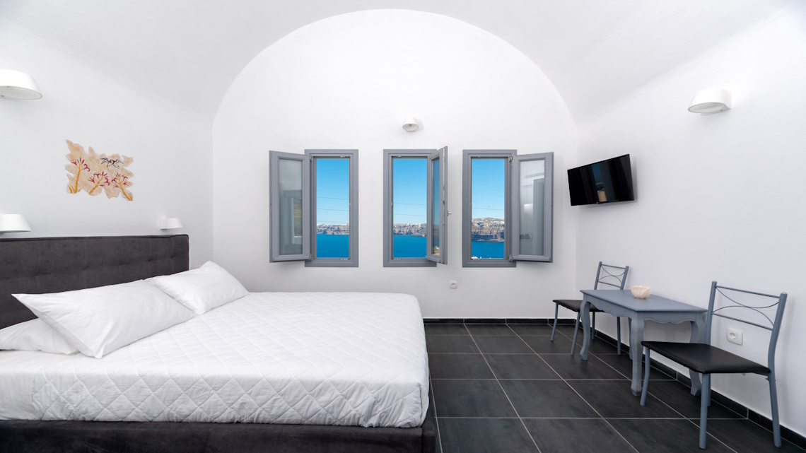 The rooms can accommodate up to 2 guests. They are an ideal choice for couples, offering unforgettable romantic moments with views of the caldera. All of our rooms feature a balcony with unobstructed views and a refreshing sea breeze.